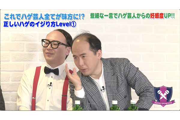 斎藤は、ハゲ芸人をピラミッド形式で表し「(バイきんぐの)小峠さんは、スキンヘッド風だからハゲとは言いづらい。デザインハゲなんです。そうなると、少し毛の残っている角野卓造氏とか、温水洋一氏。この辺が分かりやすくハゲなんです。毛が多少残っていることが大切」と説明。